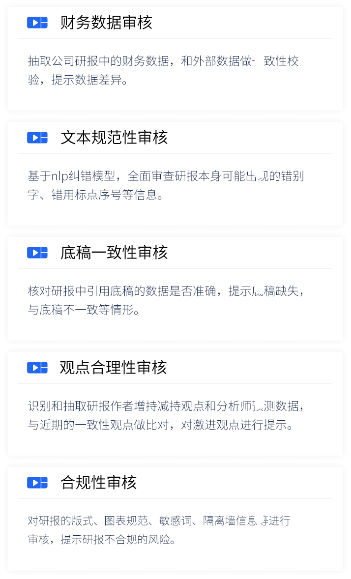 智能研报审核系统是PA真人视讯数据为券商研究所、买方研究组织等用户打造的集研报解析、抽取、审核、管理功能为一体的产品。集成OCR、NLP、机器学习等技术,对研报和底稿信息进行多方面抽取,并对研报进行数据、文本、观点等全方位的自动化审核, 同时对研报和底稿进行规范化、流程化管理,帮助用户提升工作效率,把控研报发布的时效性和合规性,全面降低出错风险。